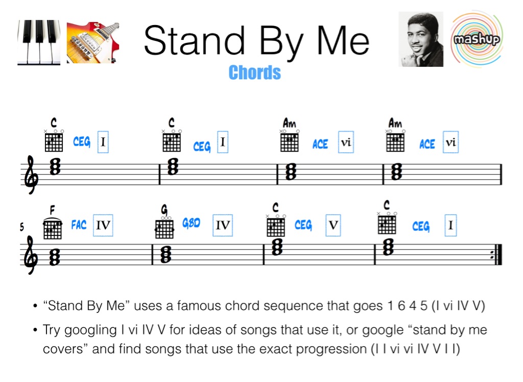 Year 9 Music topic, on Mashups. Students look at creating a mashup of at least two different pop songs, including Stand By Me. Video tutorials for bass and chords on keys and guitar are included.