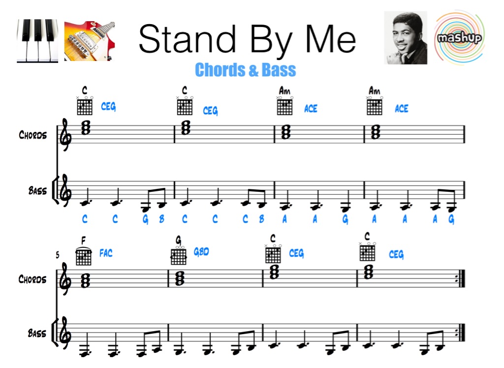 Year 9 Music topic, on Mashups. Students look at creating a mashup of at least two different pop songs, including Stand By Me. Video tutorials for bass and chords on keys and guitar are included.