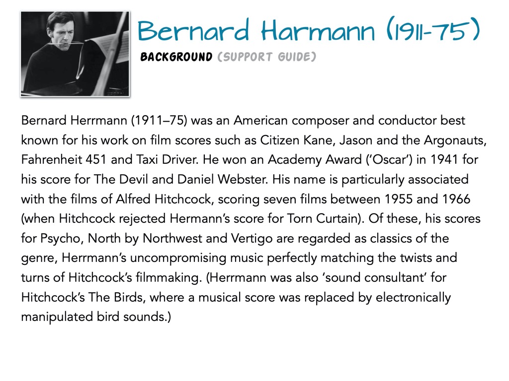 Introduction to the Edexcel A level Set work “Psycho” by Bernard Herrmann. - Contains analysis of cues and background info.